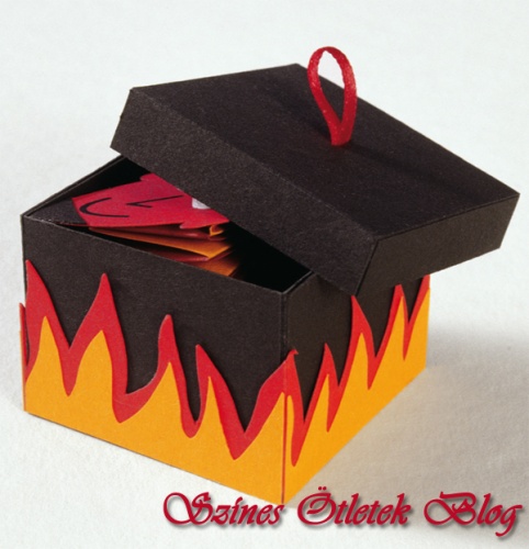 A dobozfedél közepén vágjunk egy lyukat tapétavágó késsel, majd a félbehajtott piros szalagot fűzzük át rajta, és alul a végeket ragasszuk le. Fekete kartonpapírból vágjunk 4,5 × 4,5 cm-es négyzetet, és ragasszuk a fedél belsejébe, így eltakarjuk a szalag rögzítését. A lángokat vágjuk ki mintaív alapján egyszer piros és egyszer narancssárga kartonpapírból. A narancssárga lángokat ragasszuk kissé elcsúsztatva a pirosra, majd a túllógó felesleget vágjuk le. A lángokat ragasszuk a doboz alsó szegélyére körben a kép alapján. Az ördög testéhez készítsünk harmonikahajtást (részletesen lásd lejjebb) úgy, hogy végén maradjon egy hajtásrész szabadon. Erre kerül majd a fej. A mintaív alapján vágjuk ki a fejet piros kartonpapírból. Ragasszuk fel a szemeket, rajzoljuk meg az arcot. A szarv és a szakáll fekete kartonpapírból készül. A kész fejet ragasszuk a testhez (előzőleg hajtsuk fel a szabadon hagyott hajtást, hogy a fej majd ránk nézzen). A testet ragasszuk a dobozba. Igazítsuk úgy, hogy egy kissé ferdén álljon, mintha ki akarna ugrani a dobozból. A dobozt töltsük ki selyempapírral,az ördögöt óvatosannyomjuk össze, majd zárjuk le a dobozt.